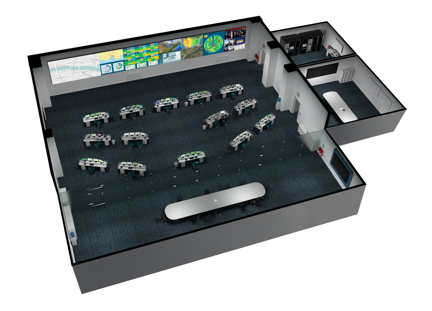 3d control room model Durch die individuelle Zusammenstellung kompatibler KVM-Komponeneten ermöglichen von uns entwickelte Lösungen für Kontrollräume eine einfache und auch in Stresssituationen fehlerfreie Bedienung der anspruchsvollsten und komplexesten Anwendungen — von der U.T.E. entwickelte und zusammengestellte Lösungen machen Systemintegratoren und Kontrollraumbetreibern gleichermaßen das Leben leichter.