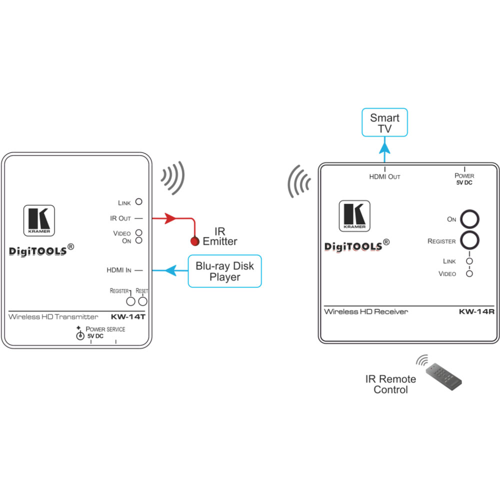 Die einzelnen Einheiten Kramer KW−14T und Kramer KW−14R bilden eine drahtlose High−Definition HDMI Sender− und Empfänger−Kombination zur latenzfreien Übertragung hochauflösender HDMI−Signale im Innenbereich.
