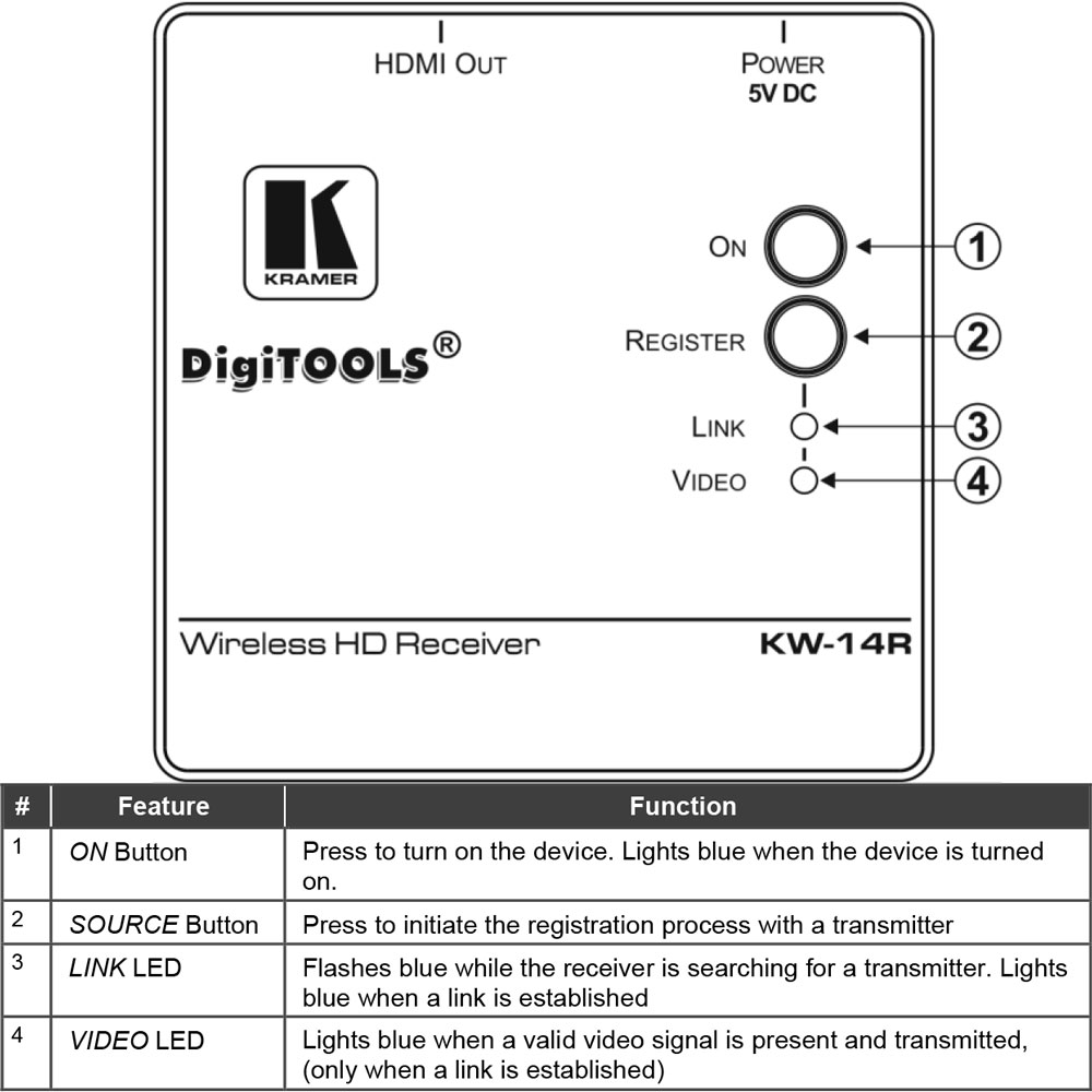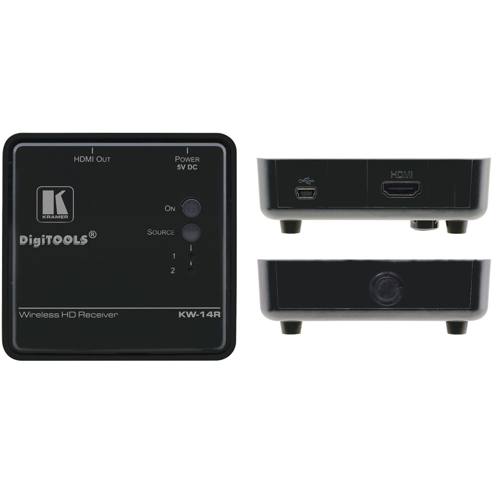 Der Kramer KW-14R erweitert das drahtlose HDMI-Übertragungssystem KW-14 von Kramer um (einen) weiteren High-Definition HDMI Empfänger. Er empfängt High-Definition HDMI-Signale im Innenbereich (auch durch Wände und Möbel) kabellos und latenzfrei eines Wireless HDMI Transmitters KW-14T aus bis zu 30m Entfernung. Durch Verwendung einer 128 Bit AES-Verschlüsselung besteht eine sichere Verbindung über die auch "sensible Daten" übertragen werden können.