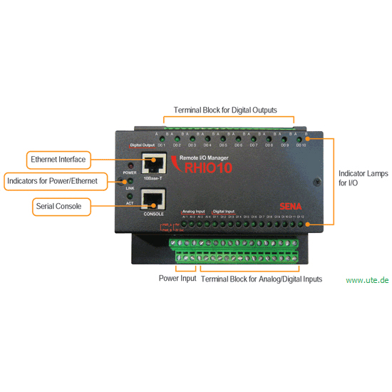 Der RHIO10 von SENA ist ein Deviceserver für Ethernet-Netzwerke, der Fernwartung und -steuerung von Geräten und Anlagen über ein Ethernet Netzwerk ermöglicht.