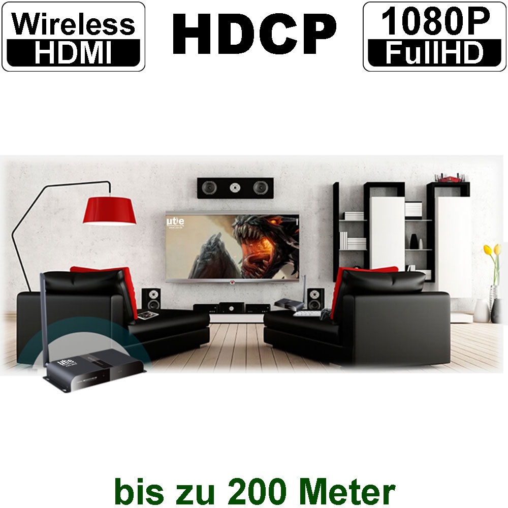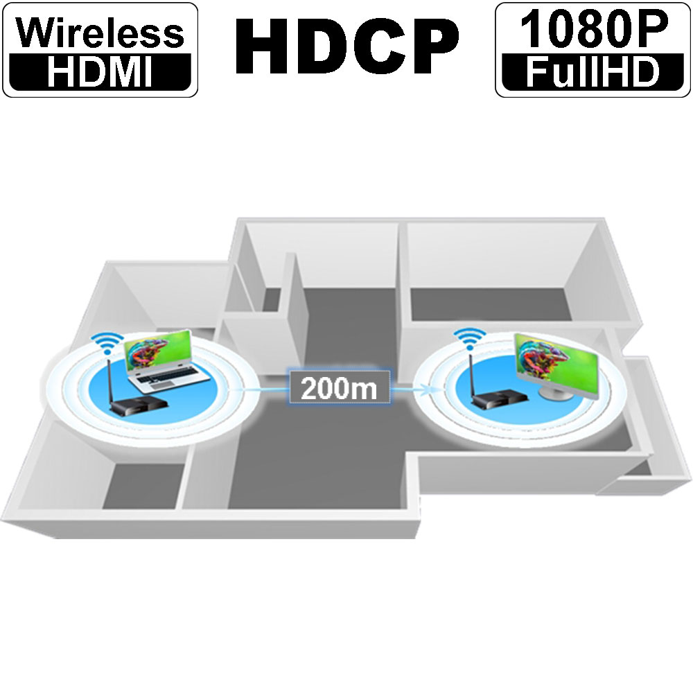 Dieser Wireless HDMI Extender überträgt HDMI A/V-Signale auch durch Wände und über (mehrere) Stockwerke hinweg, so dass Sie die Senken (HDMI-Bildschirme, HDTV, Projektoren, …) frei und volllög unabhängig vom Standort der HDMI-Quelle installieren können.