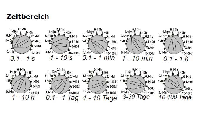Zeitbereiche / Zeiteinstellung: 0.1 sec - 100 Tage / Grob– und Feineinstellung über Potentiometer