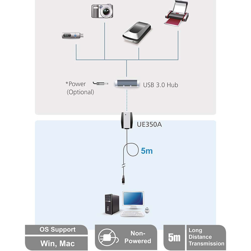 Das USB 3.1 Gen1-Verlängerungskabel ATEN UE350A verlängert die USB-Signalübertragung nicht nur um bis zu 5 Meter, sondern gewährleistet auch einen Datendurchsatz von 5 Gbps, wenn es zusammen mit einem USB 3.1 Gen1 Host und einem kompatiblen Gerät eingesetzt wird – eine atemberaubende Verzehnfachung im Vergleich zu USB 2.0.