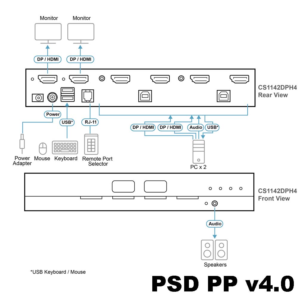 Technische Daten des 2fach 5K DP/ HDMI KVM Switchers (PSD PP v4.0-konform): CS1142DPH4