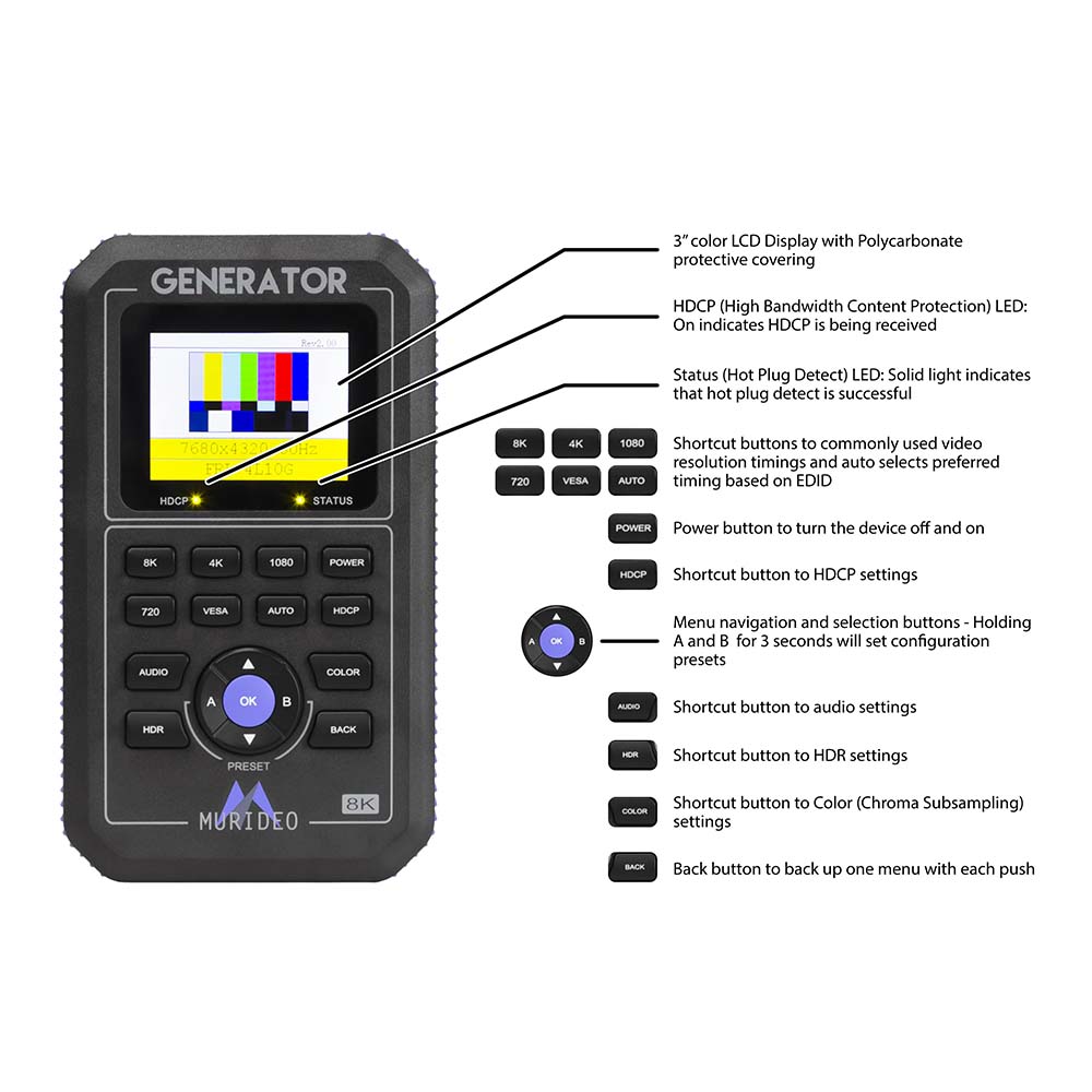 Technische Daten des 8K60 HDMI2.1 Signalgenerator und-analyzer Kits Fox & Hound 8K von Murideo