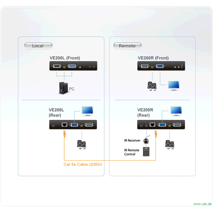 Die A/V-Verlängerung für VGA und Stereo-Audio VE200 von ATEN ermöglicht die Übertragung des Bildsignals zwischen Computer und Monitor bis zu 150 m bei Auflösungen bis 1600 x 1200 bei 60 Hz. Das VGA-Extender-System besteht aus einer lokalen (VE200L) Sende- sowie einer Empfangseinheit (VE200R) für die Gegenstelle, die über ein verdrilltes Kat. 5e-Kabel verbunden werden.